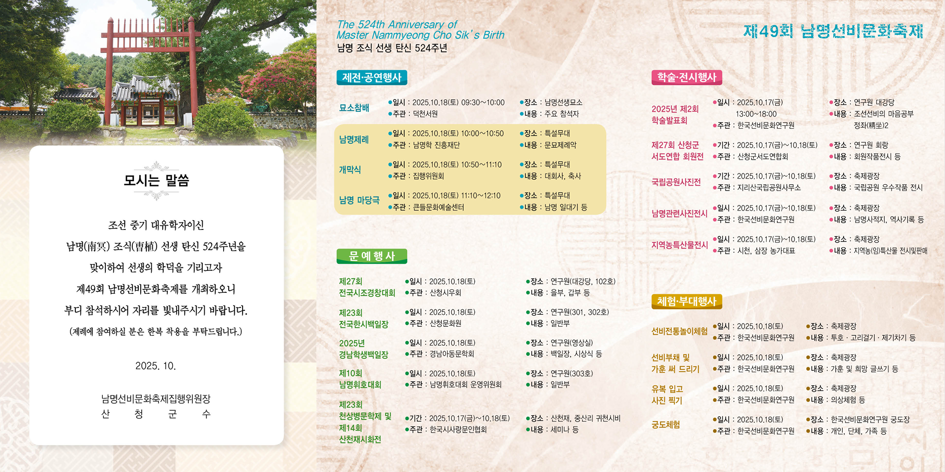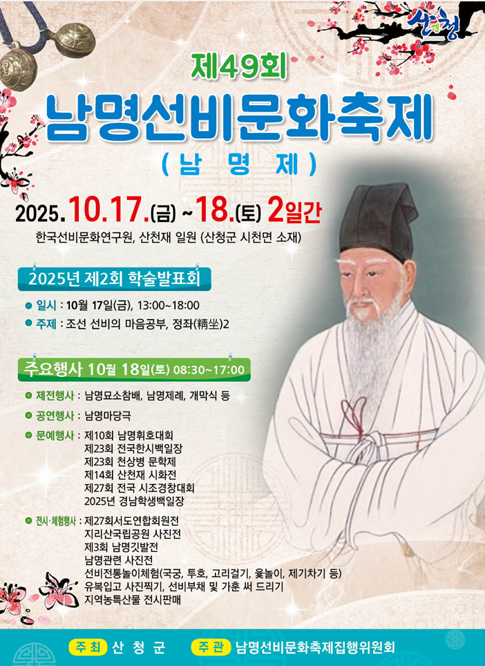 제49회 남명선비문화축제 (마당극 남명) 공연 안내 페이지 정보 작성자 진주큰들 작성일2025.10.01 조회27회 댓글0건 본문 행사명 : 제49회 남명선비문화축제 (마당극 남명) 공연일시 : 2025년 10월 18일(토) 오전 11시 10분 ~장소 : 한국선비문화연구원 특설무대 (경남 산청군 시천면 소재) 다음글 목록