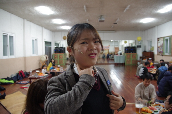 큰들에서 나이 차이가 그나마 적게 나는 전새별 단원이 핀마이크 착용을 도와주고 있습니다.