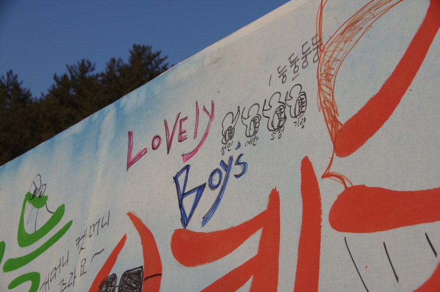 첫날, 아이들을 환영했던 현수막은 오늘 낙서판이 되었습니다.