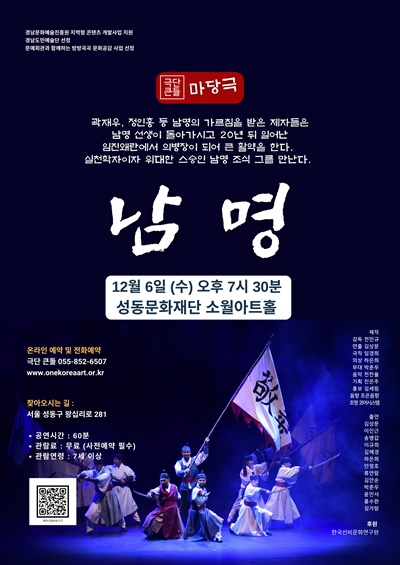 극단 큰들은 조선시대 선비 남명 조식((南冥 曺植, 1501~1572)을 다룬 마당극 <남명>을 제작해 오는 12월 6일 저녁 서울 성동문화재단 소월아트홀에서 공연한다.