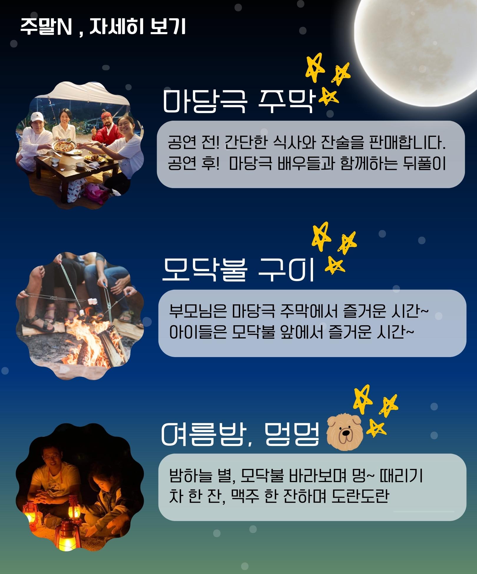 그 외 마을까페, 마당극주막, 낚시터&모닥불구이, 여름밤 멍멍(불멍, 별멍)' 프로그램도 준비되어 있습니다.