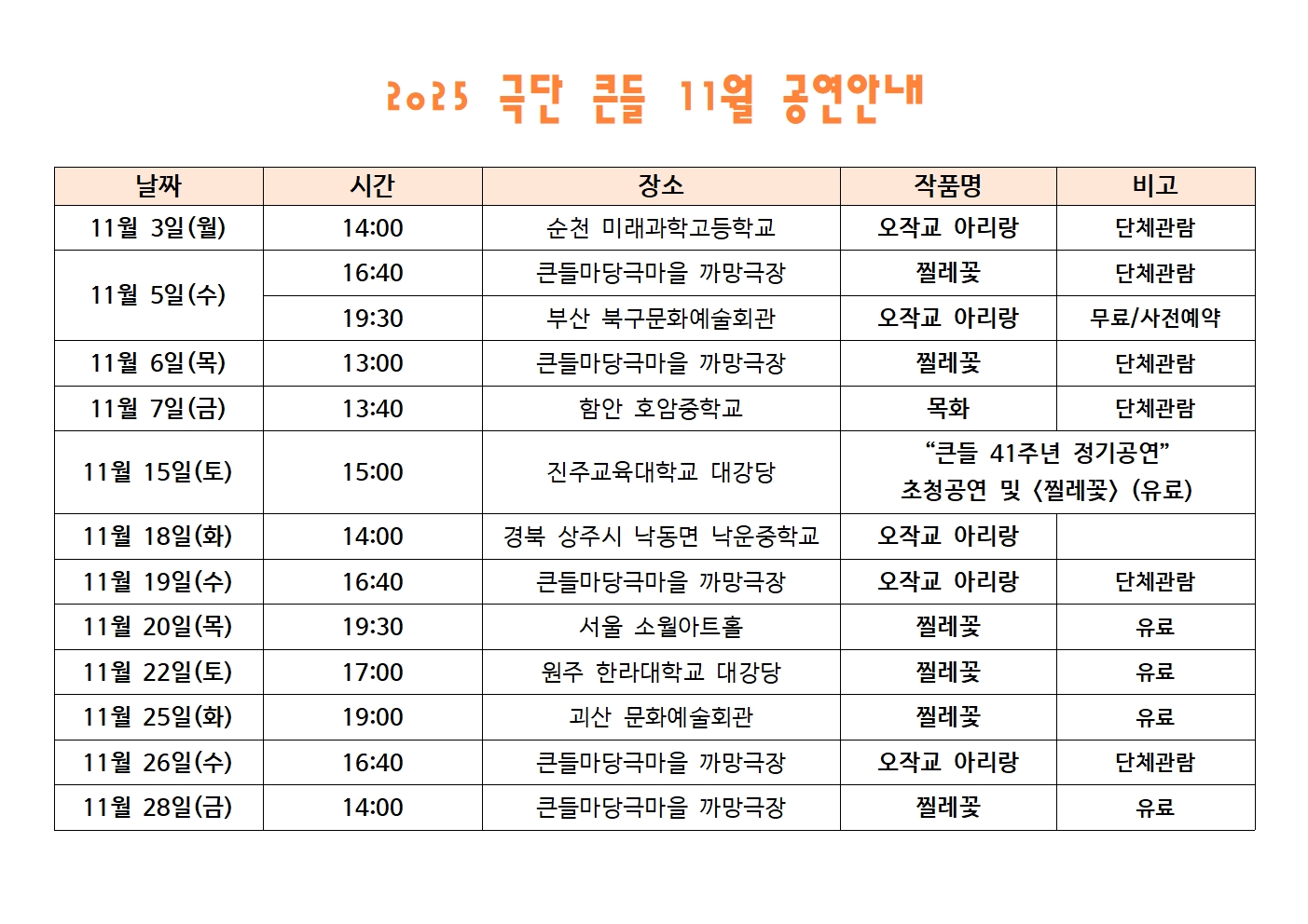 큰들 11월 공연일정 안내 페이지 정보 작성자 진주큰들 작성일2025.11.01 조회108회 댓글0건 본문 ☏ 문의 : 극단 큰들 사무실 055-852-6507☎ 담당자 : 010-8512-9158 이전글 다음글 목록