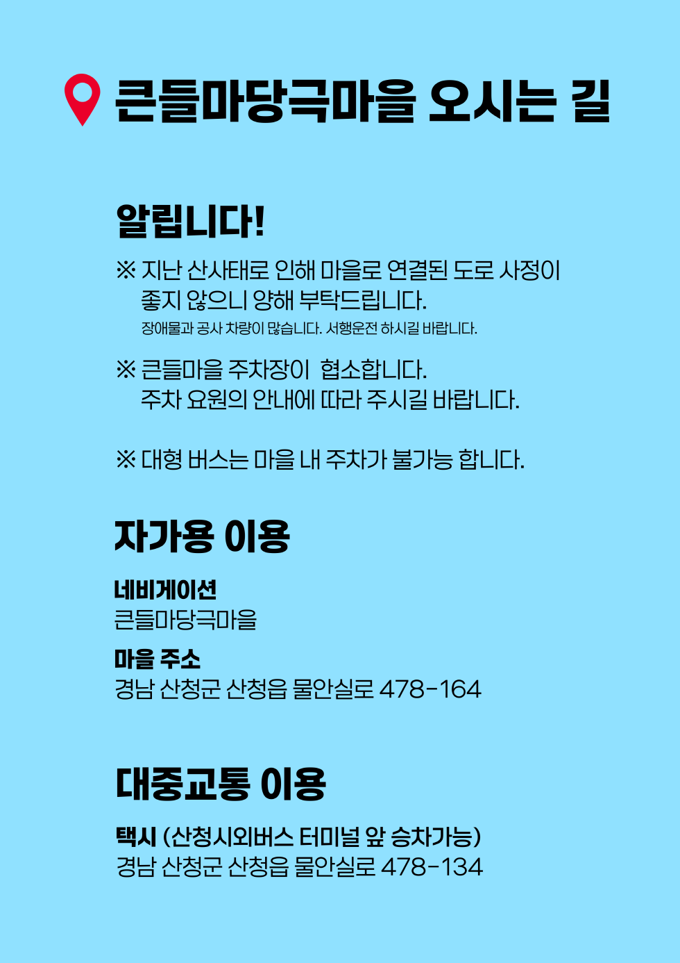 (52210) 경남 산청군 산청읍 물안실로 478-119. 1층 (큰들마당극마을)